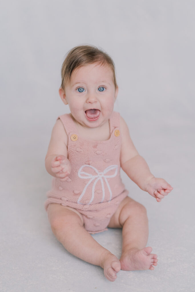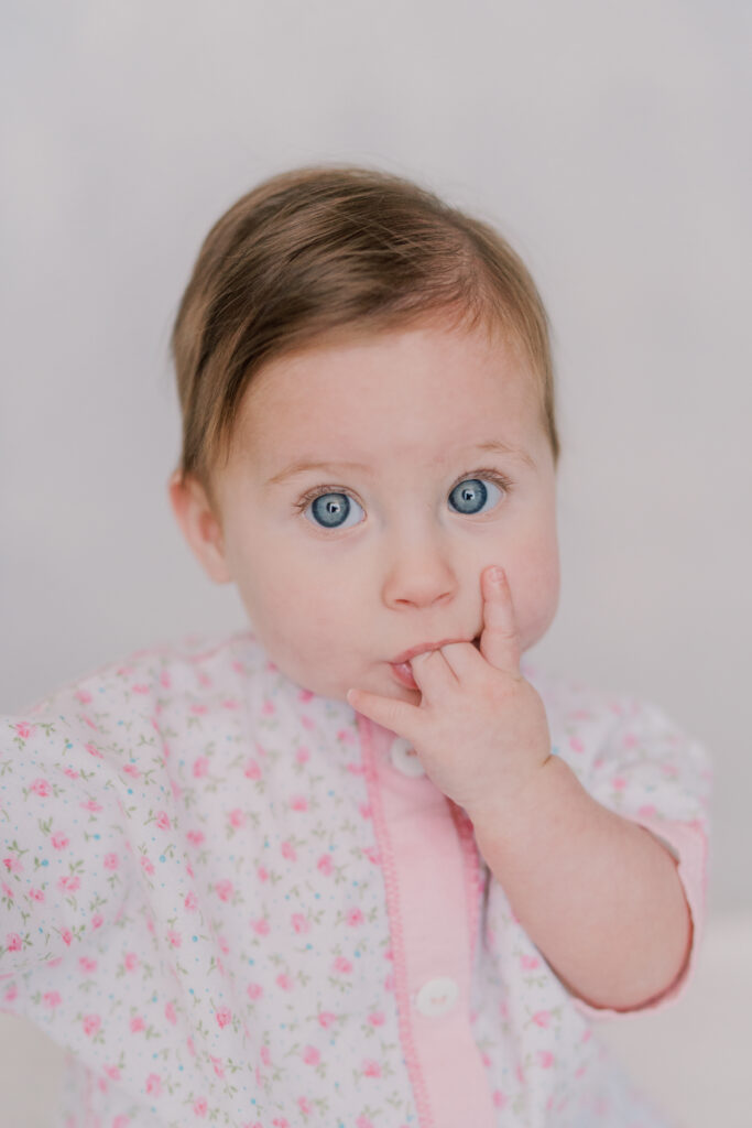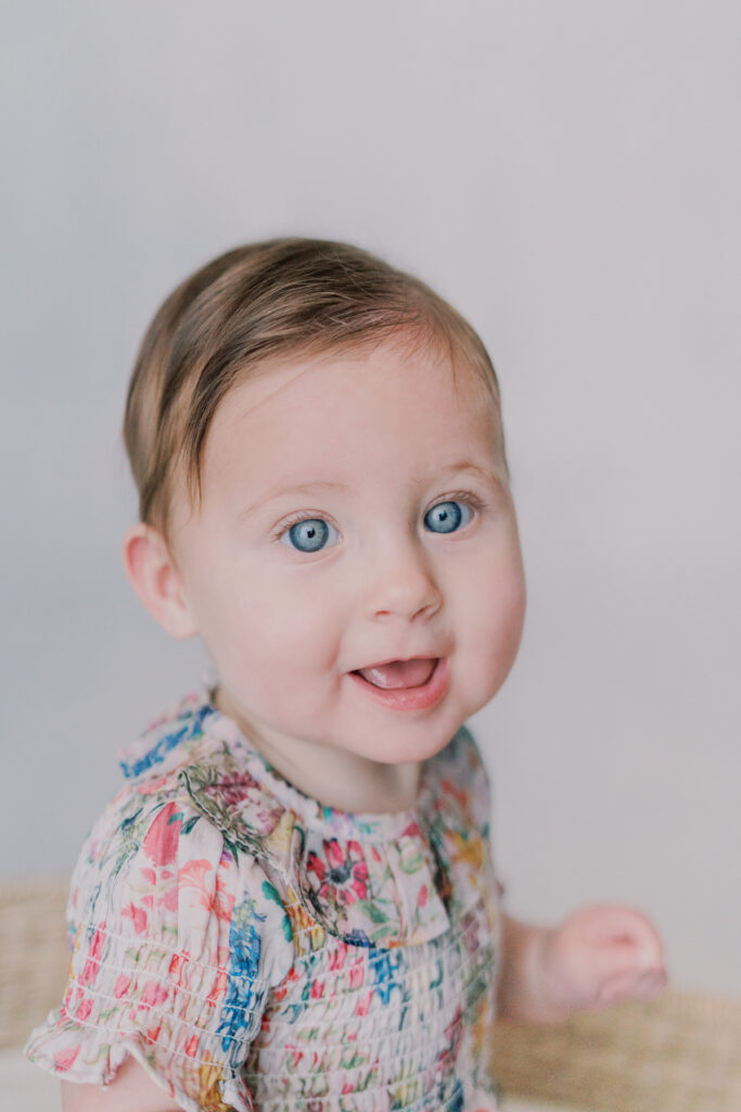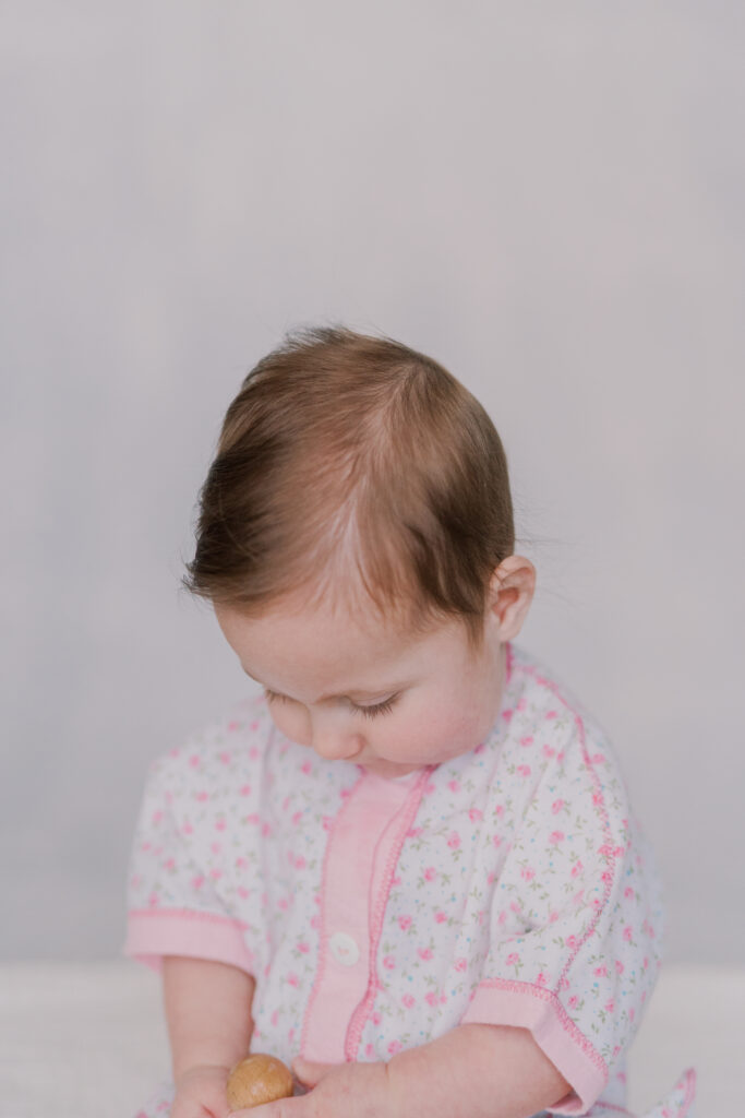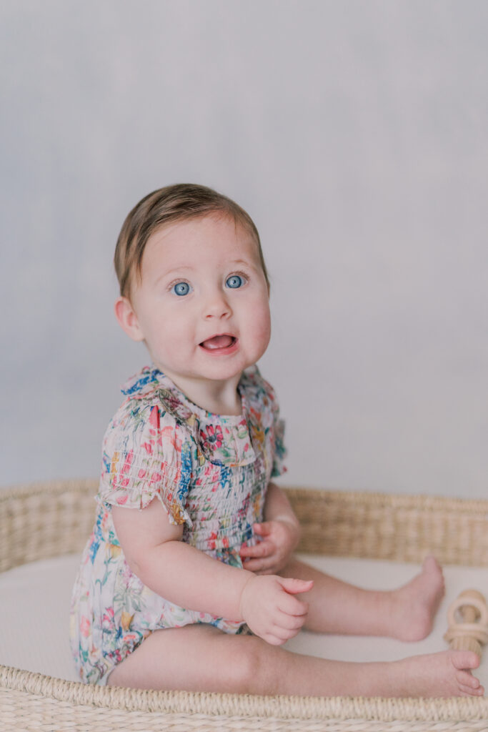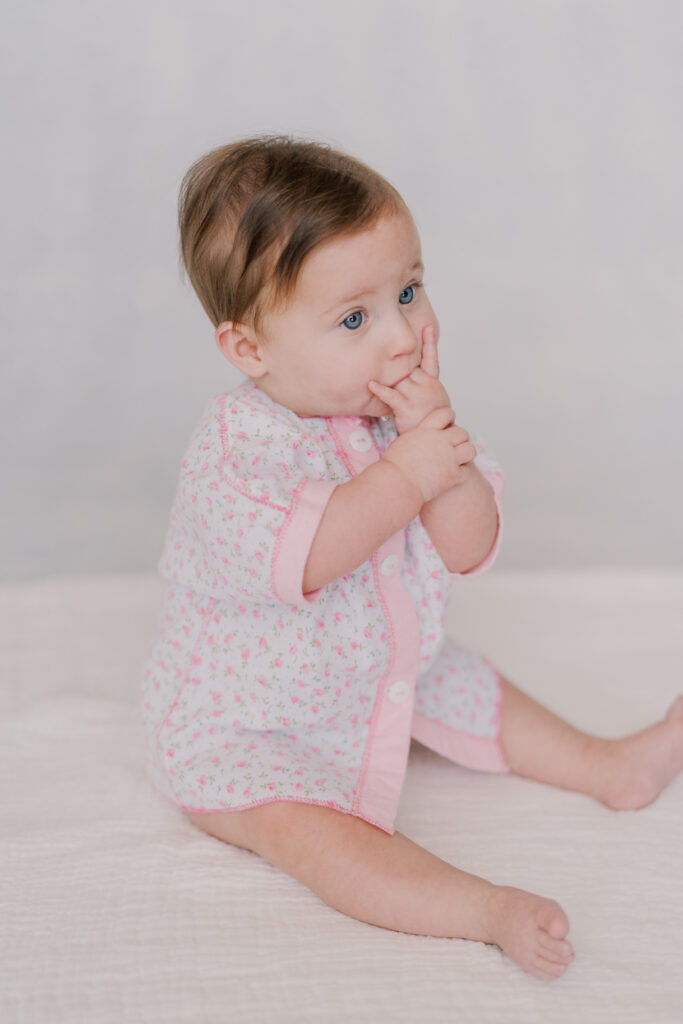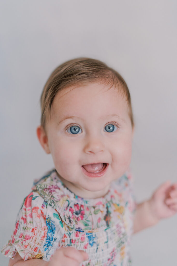 Sweet little Mary has hit such an exciting milestone! She can sit up all on her own! Our session was full of giggles, tiny waves, and a little singing to keep those smiles coming. Her bright blue eyes absolutely sparkle, and I can’t believe how much she’s grown.